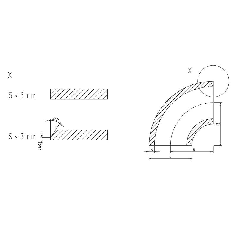 90° Alu Rohrbogen 1", Sch. 40, r=38 mm, LR, ähnl. DIN 2605 , aus EN AW-5083, AlMg4,5Mn0,7 mit 37,5° Fase, ASME B16.9